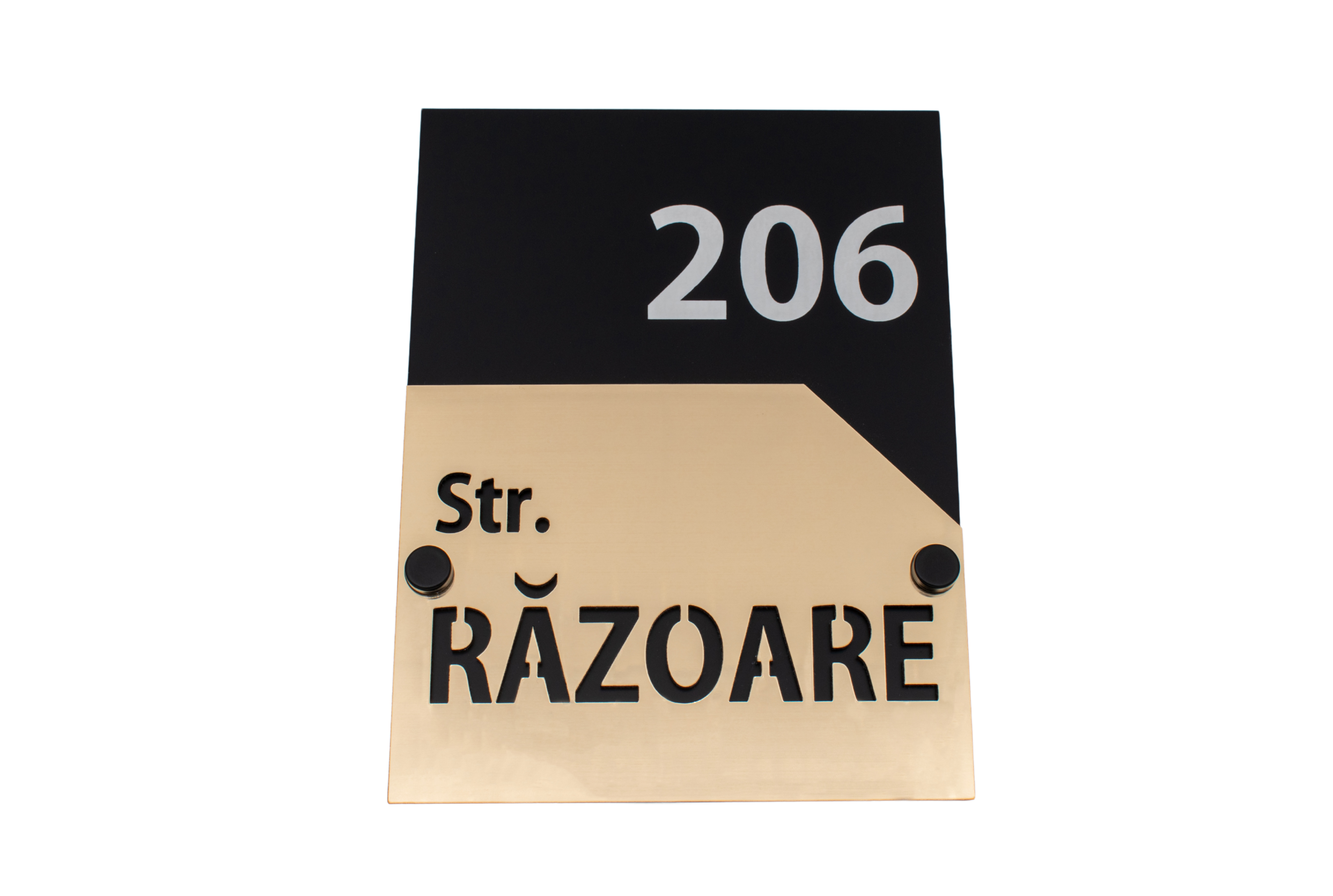 Dimensiuni: 20x15cm. Produsul este format din 2 bucăți, suportul din spate fiind negru, iar numele străzii fiind decupat din bucata aurie.