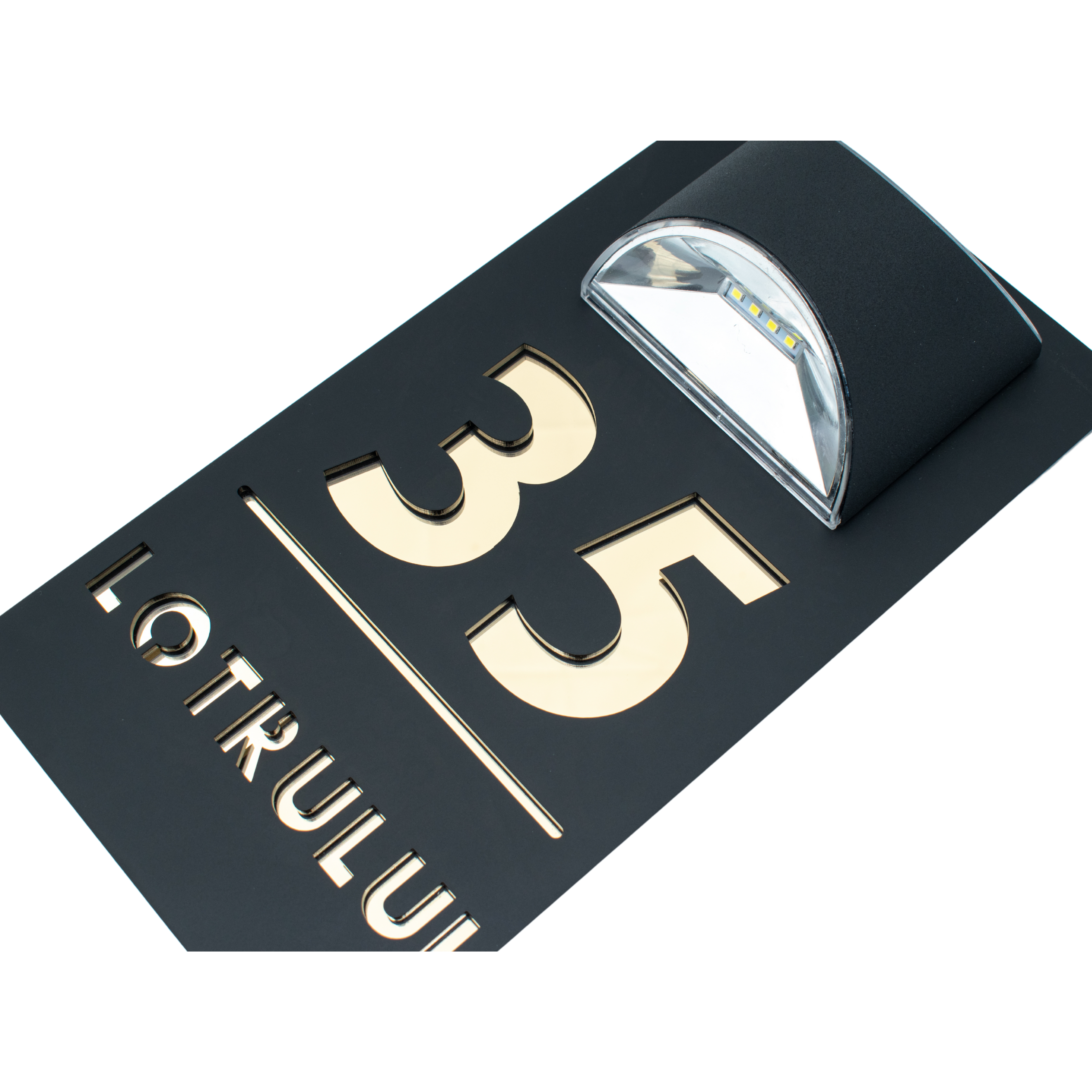 Număr casă cu lampă solară neagră, Negru/Auriu Oglindă, din plexiglas durabil. Vizibilitate perfectă pe timp de noapte și un aspect sofisticat pentru orice locuință.