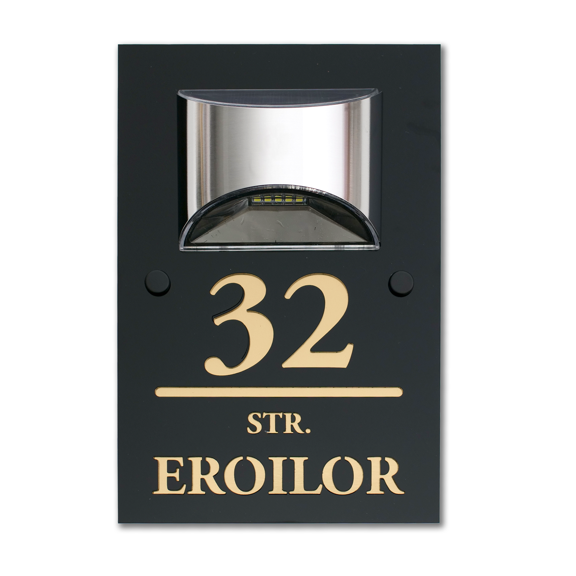 Acest model de număr de casă cu lampă solară și distanțiere negre din oțel include următoarele informații ce pot fi gravate pe plăcuță landscape: numărul apartamentului și numele familiei.