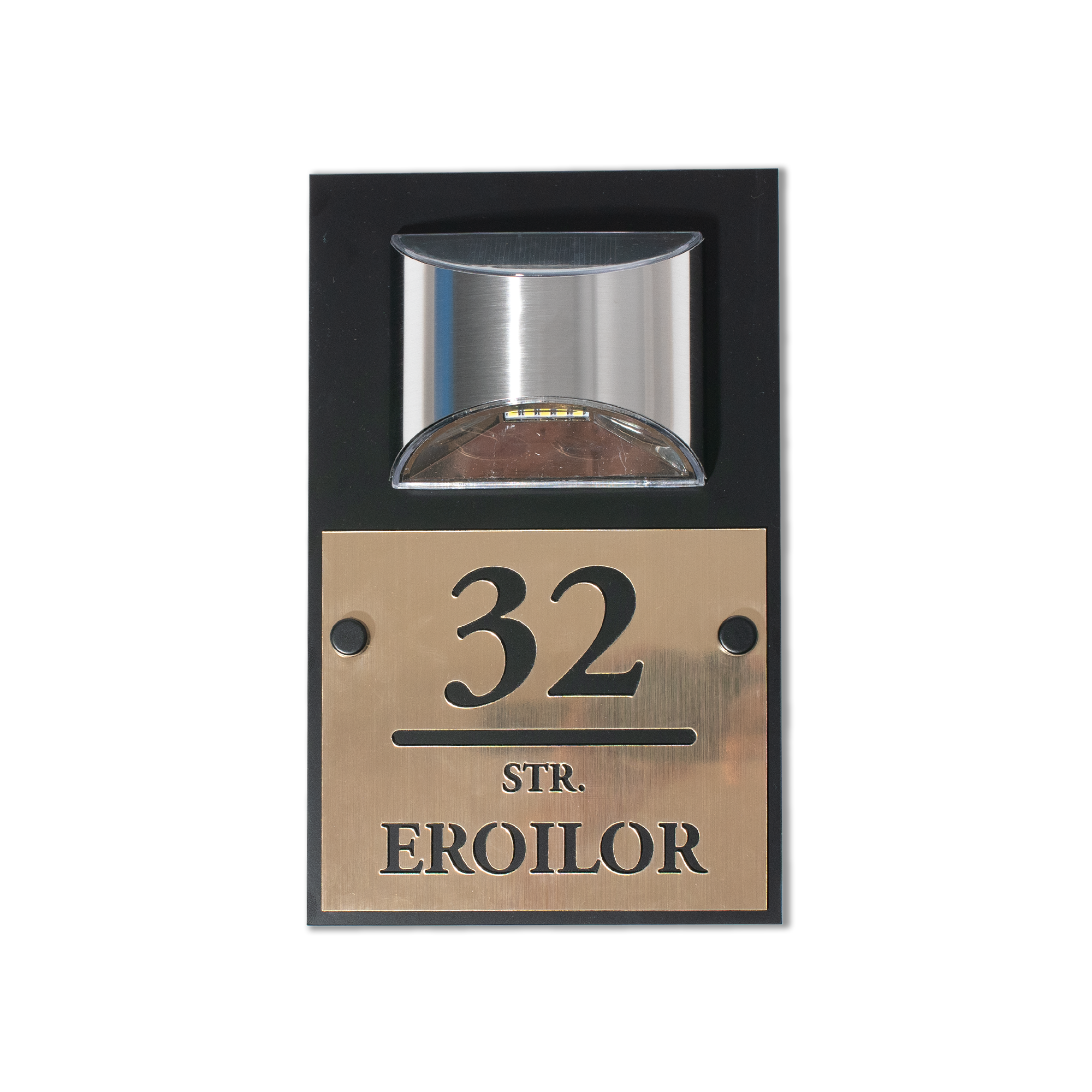 Acest model de număr de casă este format din următoarele componente: suportul sau plăcuța ABS, plăcuța gravată cu adresa este detașabilă, lampa solară și 2 distanțiere negre din oțel. Distanțierele din oțel au dimensiuni de 12x25mm, pachetul nu include: dibluri și alte sisteme de prindere.