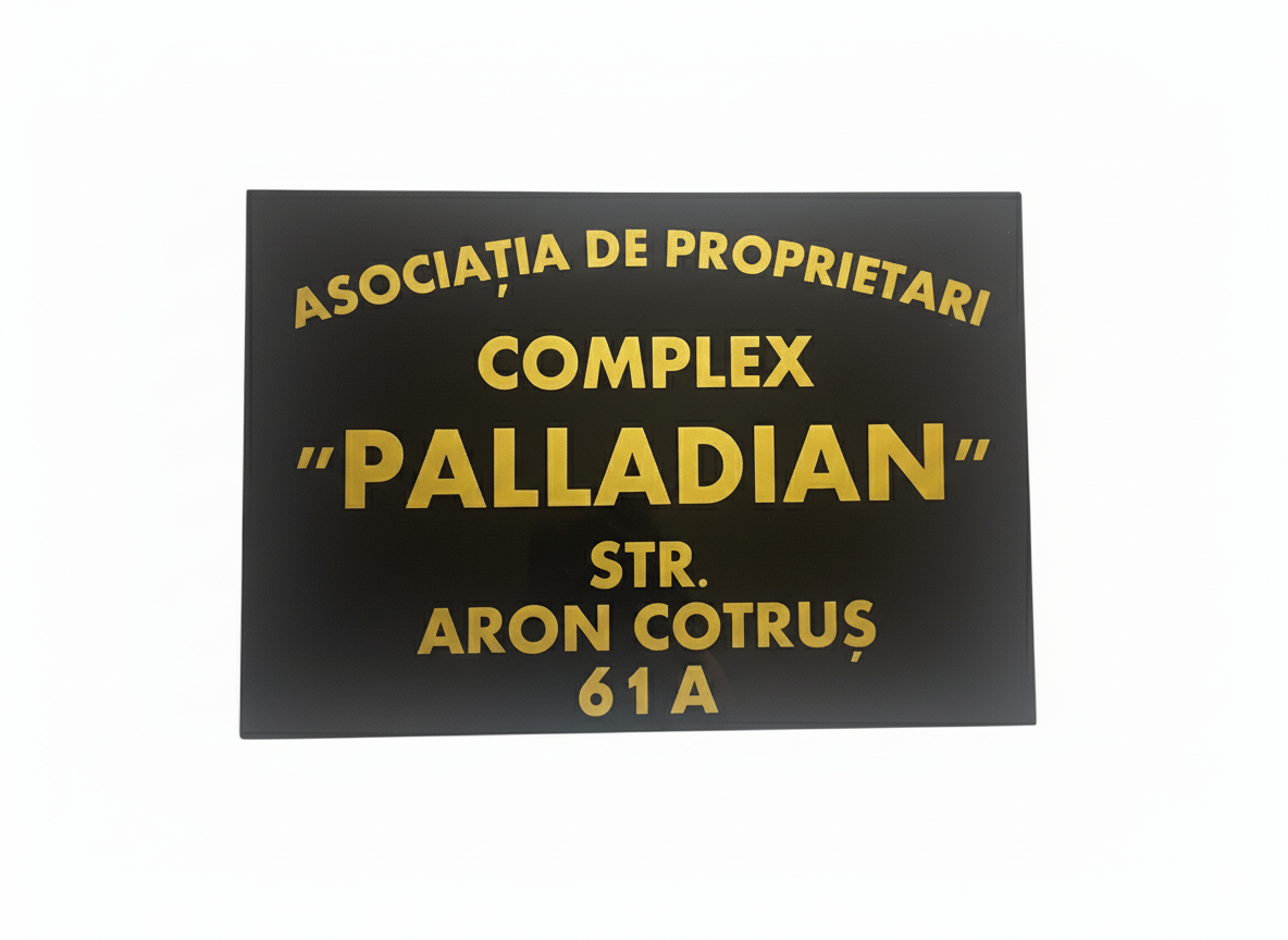Oferă clădirii tale o imagine elegantă și profesională cu plăcuța de semnalistică din plexiglas cu inscripție din autocolant auriu, concepută pentru a atrage atenția și a rezista în timp. Acest produs este ideal pentru blocuri, ansambluri rezidențiale, sedii de firmă, cabinete, birouri sau asociații de proprietari. Realizată din plexiglas de calitate premium, placa are un aspect modern și rafinat. Autocolantul auriu aplicat cu precizie oferă un contrast puternic și o vizibilitate excelentă, transformând orice intrare într-un punct de reper ușor de recunoscut.